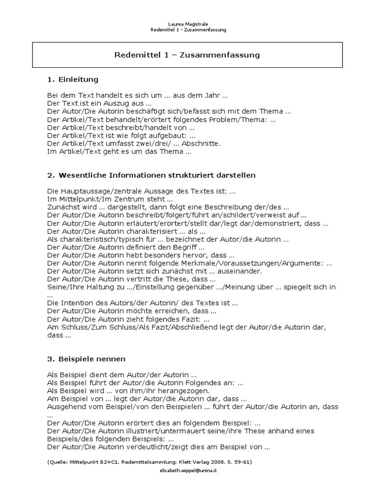 1.einleitung der artikel/text beschreibt/handelt von im documents similar to redemittel zur zusammenfassung. Der autor/ verfasser, stellt folgende behauptung auf. Redemittel für die neue b2 prüfung des goethe instituts finden sie hier (modul schreiben) und hier (modul sprechen) schriftlicher ausdruck lesebrief berlin, den 08.10.08 an die …. Dazu benötigen sie lediglich einige redemittel, die wir im folgenden erläutern möchten. Redemittel zusammenfassung redemittel zur zusammenfassung einleitung bei de te t ha delt klett verlag 2008.